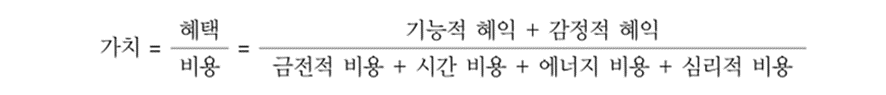 보다 구체적으로 가치는 고객이 얻는 것(기능적 그리고 감정적 혜택)과 주는 것으로 형성됩니다. 금전적 비용, 시간 비용, 에너지 비용 그리고 심리적 비용의 비율입니다. 그러므로 가치는 다음과 같이 나타낼 수 있습니다.